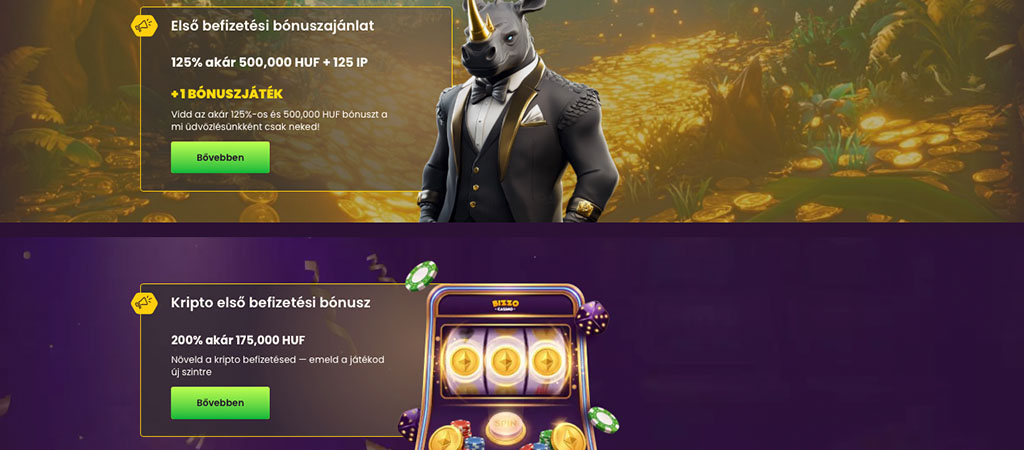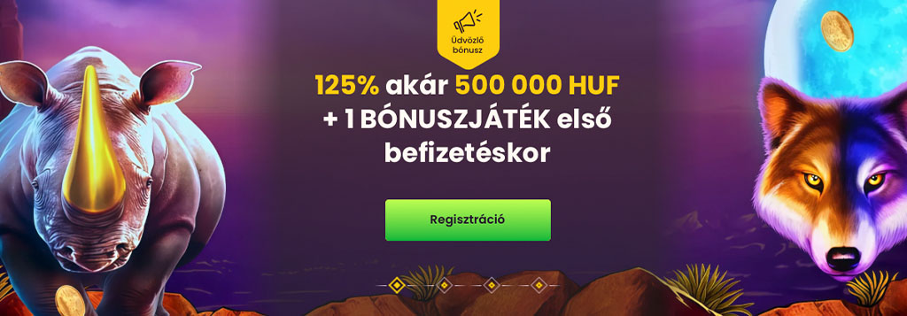 - Első befizetési bónusz: 125% akár 500.000 Ft + 125 ingyenes pörgetés + 1 bónuszjáték