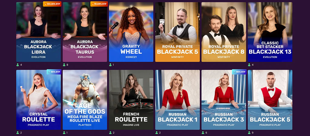 A játékosok olyan népszerű asztali játékokból és élő játékműsorokból válogathatnak, mint például a: