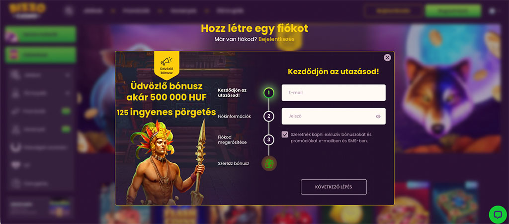 Kattints a BizzoCasino weboldalán a regisztráció gombra, és kövesd az alábbi lépéseket: