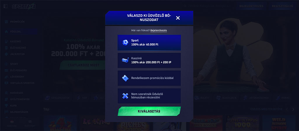 - Kattints a Regisztráció gombra és válaszd ki a számodra kedvező bónusz ajánlatot